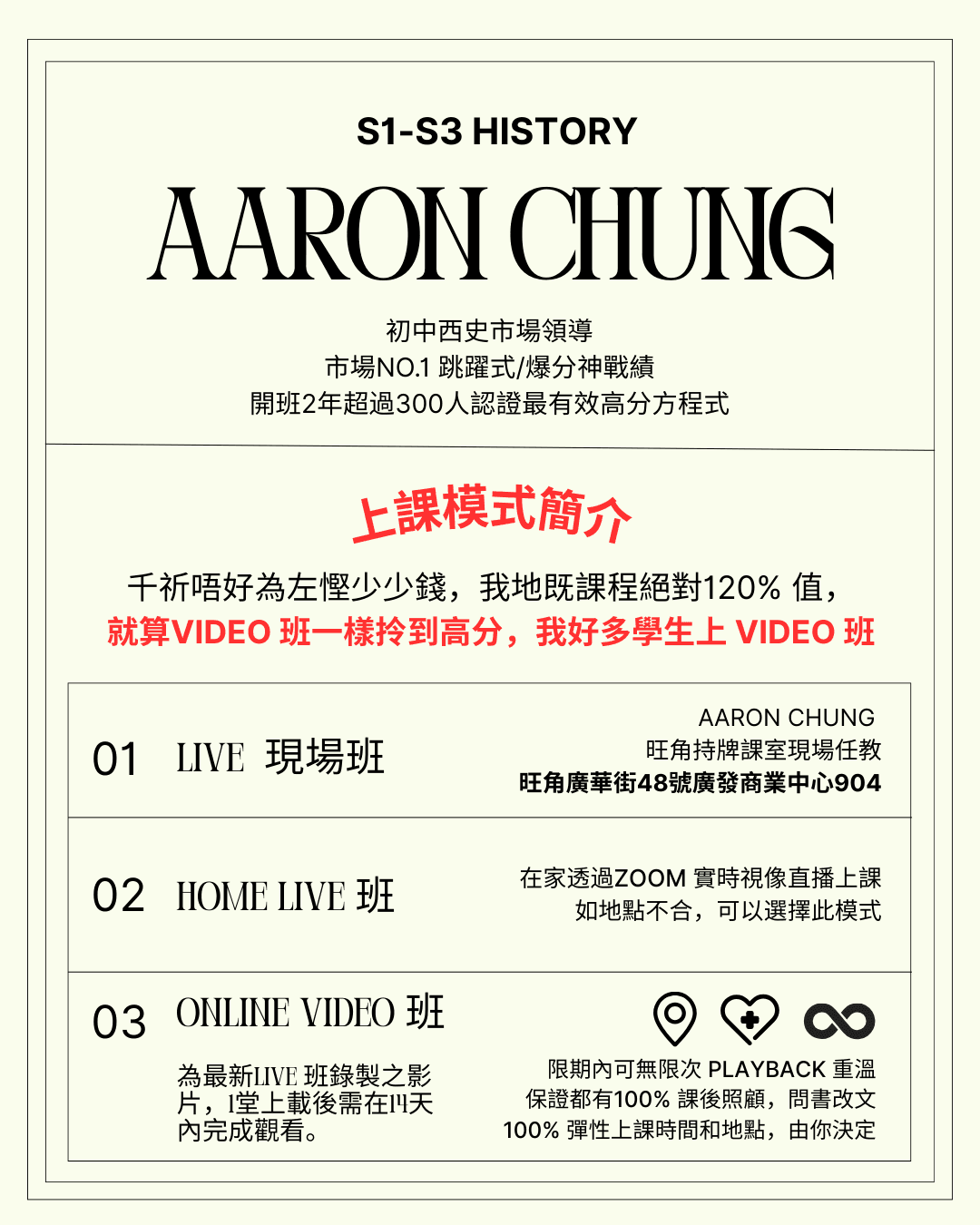 就算學校偷鷄沒有某一個TOPIC,也一定要跟足每一期,因爲我的課堂并不是主力講内容 (你學校也會講),主要是教資料題答題技巧,即【閱讀理解】,完全是靠資料拿分,全部TOPIC 通用。我亦會打散TOPIC 漸進式教技巧,如你執意跟一期唔跟一期,將會十分影響你的考試答題觸覺及整套技巧的輸入